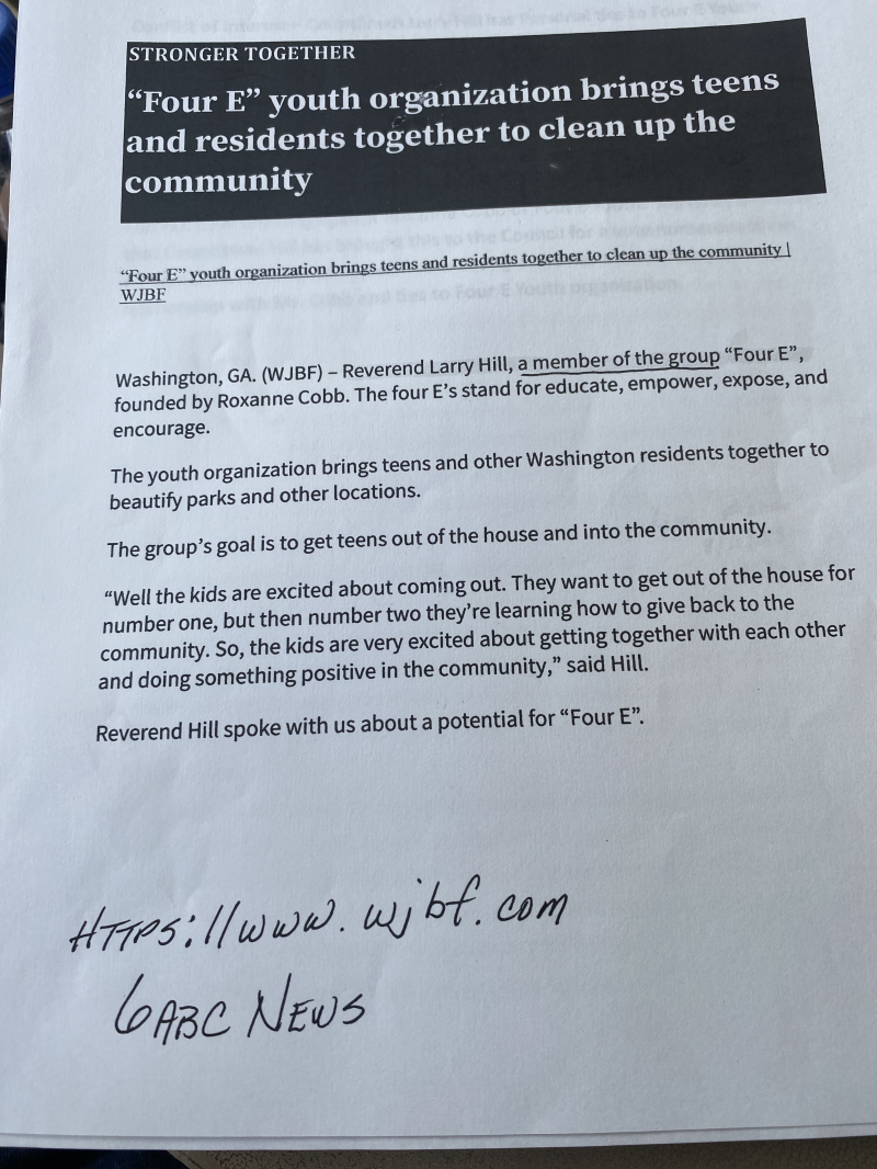 The complaint was made by Lisa Fisher. Fisher was appointed by Bailey to be a commissioner of the Housing Authority Board and she is the wife of current District 2 councilman, David Fisher. The complaint has a handwritten date of 8/11/25, and was filed approximately three hours prior to the city council meeting, 2:30 PM. It is unknown who wrote this on the document or who received the complaint. The City of Washington municipal code states any ethics complaint made of a council member is to be made to the mayor. Fisher alleges in the complaint “Conflict of Interest-Councilman Larry Hill has personal ties to Four E Youth organization and she shares quotes from interviews with Roxeann Cobb, founder of the organization and things Hill has said in support of the organization. She references state codes but none of the codes listed in the City of Washington Municipal charter, which the city is governed by. She also mentions that Hill has encouraged the city to donate money to Four E Youth to help with costs of educational trips and summer programming. It is unknown at this time who wrote CASE CLOSED across one of the documents, as per the city code, no one person can decide the outcome of an ethics violation report.